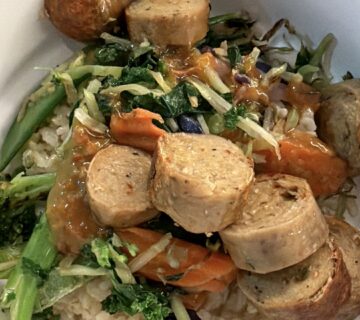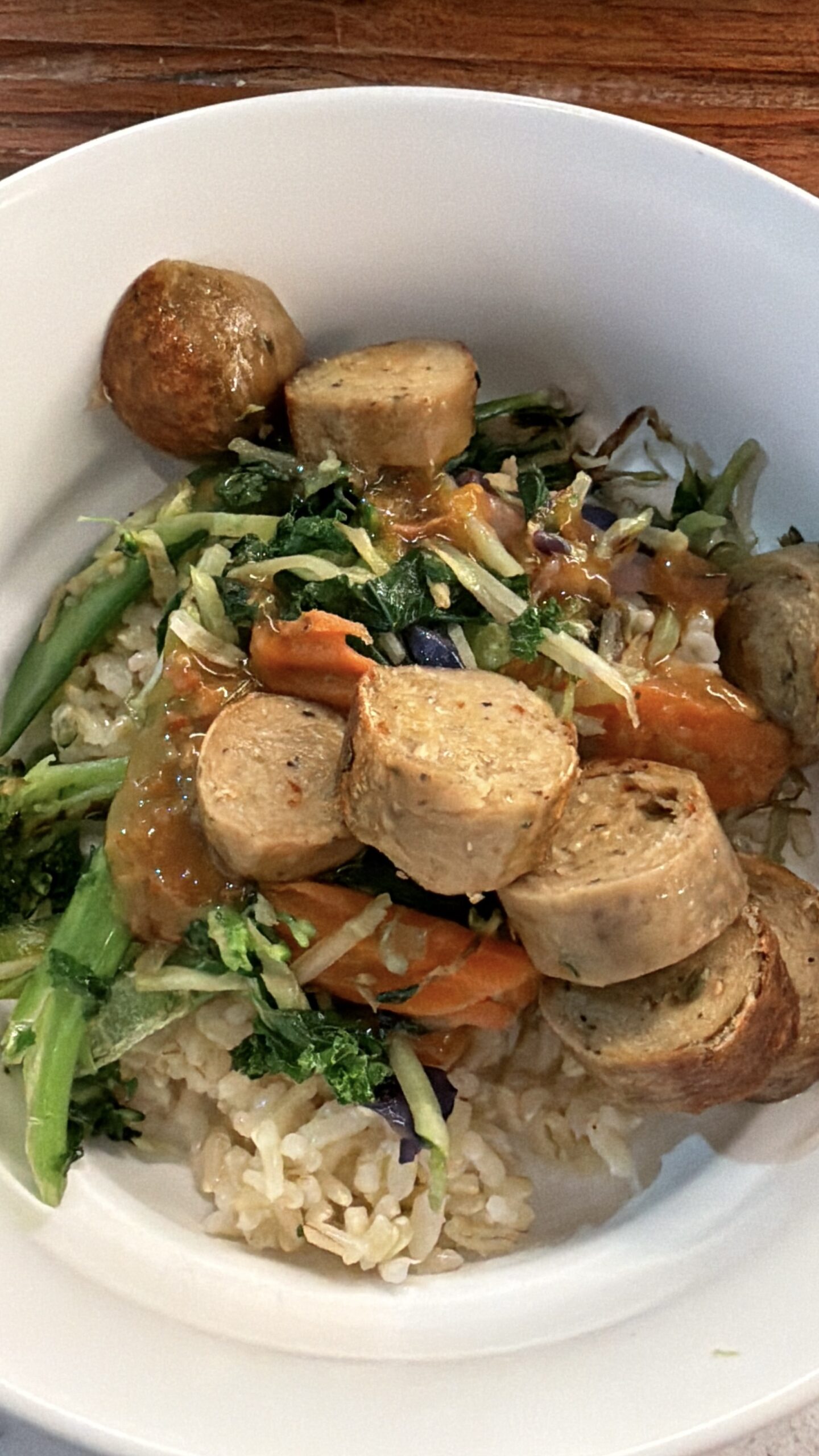 This 10-minute veggie sausage stir fry bowl is one of my go-to meals when I need something fast, filling, and toddler-approved. Made with a few Trader Joe’s staples and finished with a sweet Thai ginger sauce, it’s a no-overthinking kind of meal that still feels complete.