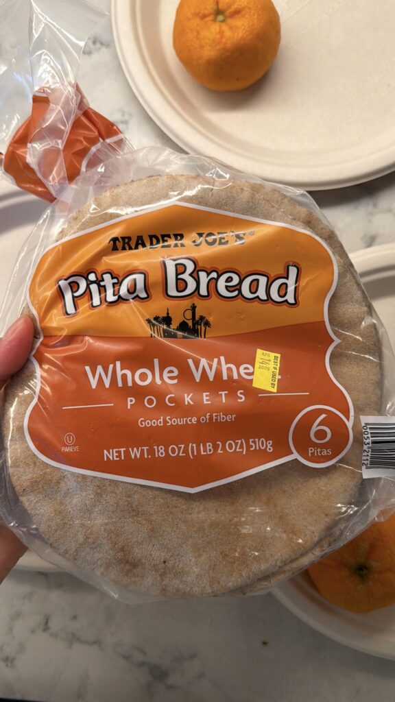 - Whole wheat pita (½): ~$0.50–$0.75