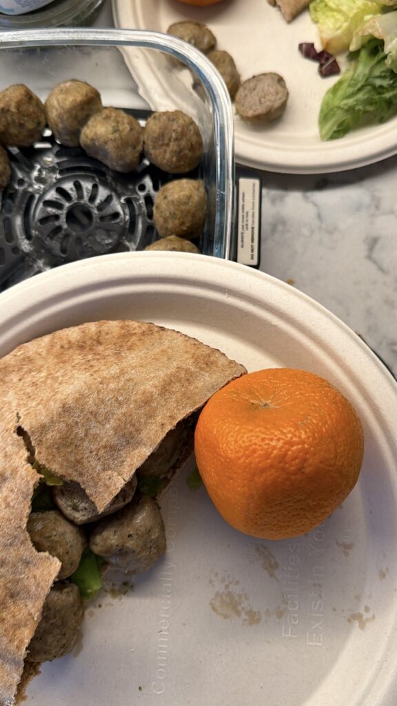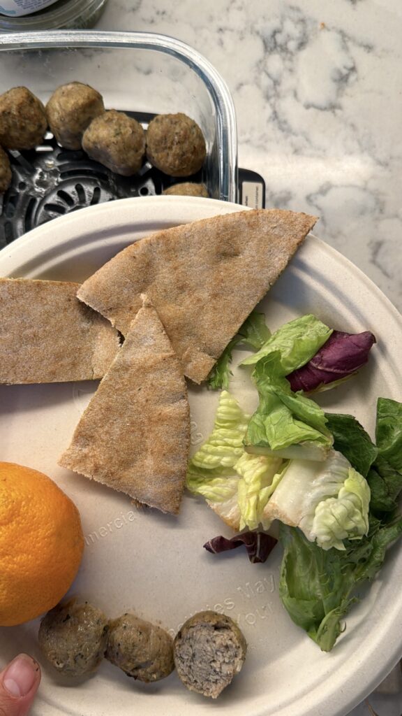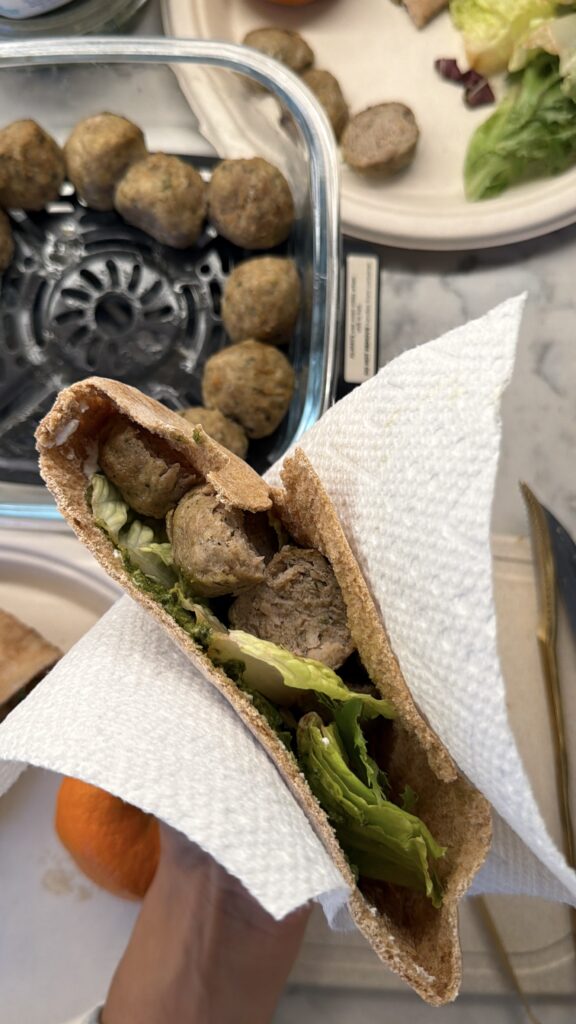 Place chicken meatballs in the air fryer and cook for about 6 minutes (or according to package instructions). - Prep the pita