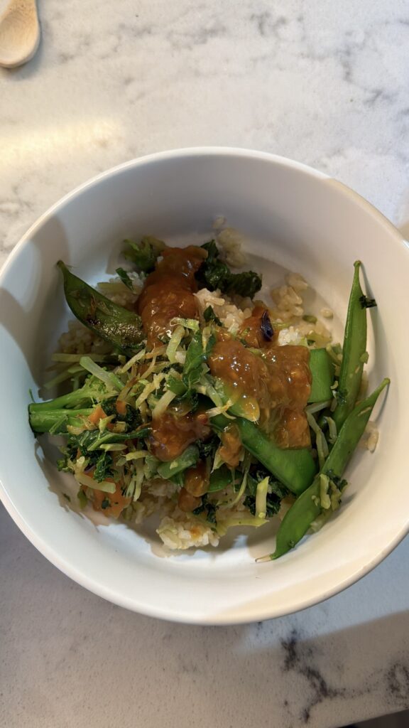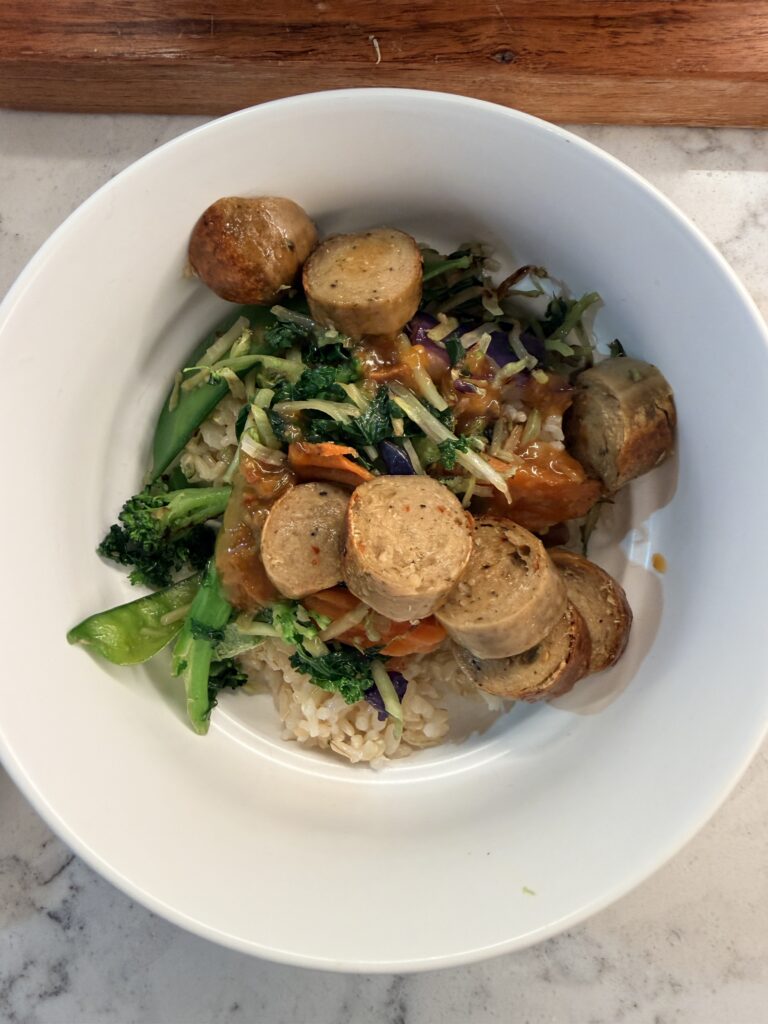 This veggie sausage stir fry bowl has quietly become one of those default meals in my routine—the kind I make when I don’t have time (or energy) to think, but still want something warm, balanced, and actually satisfying.